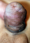 La imagen corresponde a u niño que tras un postoperatorio normal retira la sonda vesical al 7º día  y acude a las 24 horas por inflamación importante de la piel de pene y escroto con dificultad para la micción y no  había fístula cutánea.