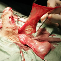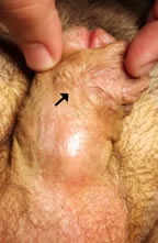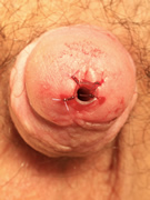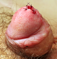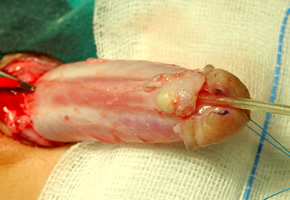 Aunque en estos pacientes no suele existir ya prepucio dorsal con el fin de reforzar la sutura puede emplearse tanto el dartos cercano, que procede del colgajo de Belman que se realizó en la cirugía previa, o si no es posible puede emplearse entonces la vaginal testicular.
