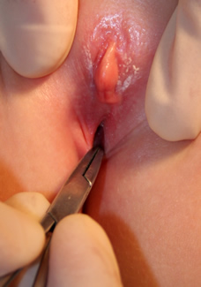 La separación manual forzada en la consulta tras la aplicación de una crema anestésica es resolutiva. La necesidad de una técnica bajo anestesia es anecdótico.