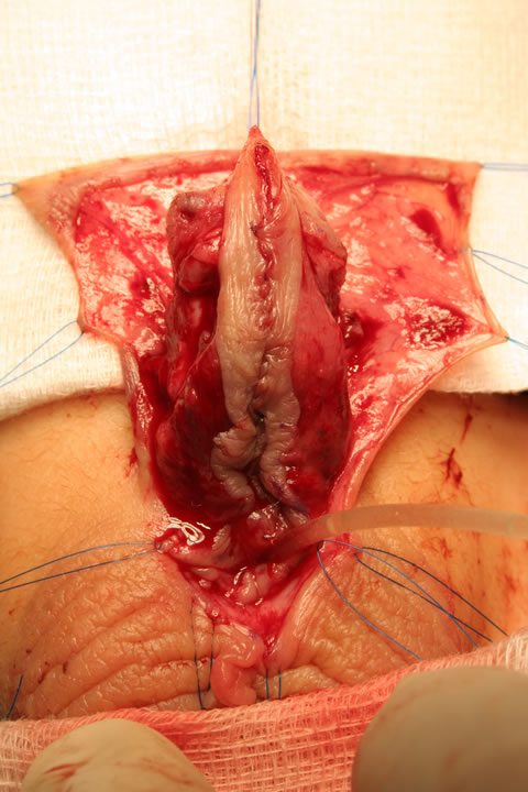 En los casos de megameato en que no hay curvatura y el prepucio está intacto se puede emplear la técnica que Duckett llamó de la pirámide.