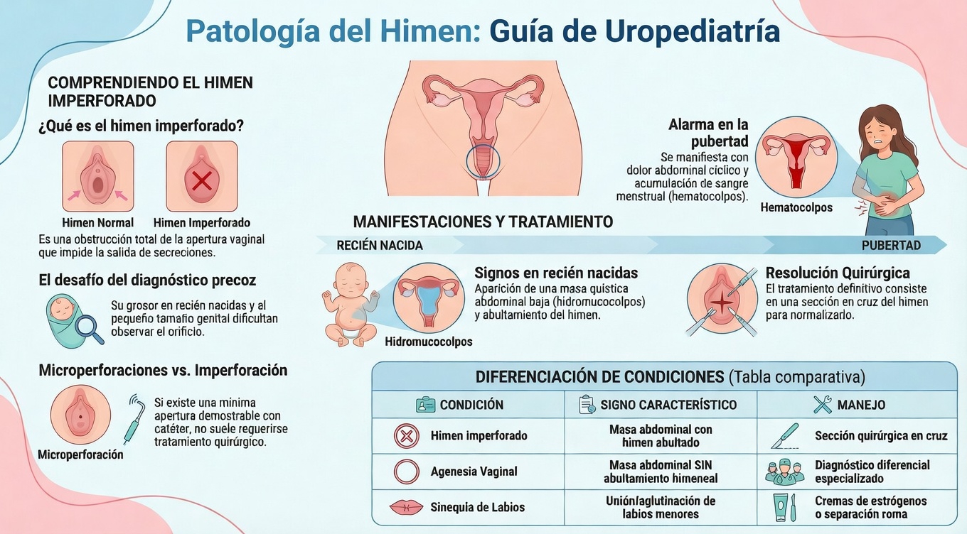 El espesor del collar mucoso y el pequeño tamaño de los genitales externos en la recién nacida hace difícil observar el orificio vaginal en muchas niñas. Por esto muchas niñas con himen imperforado no se diagnostican hasta que desarrollan síntomas de dolor abdominal cíclico y hematocolpos en la pubertad.