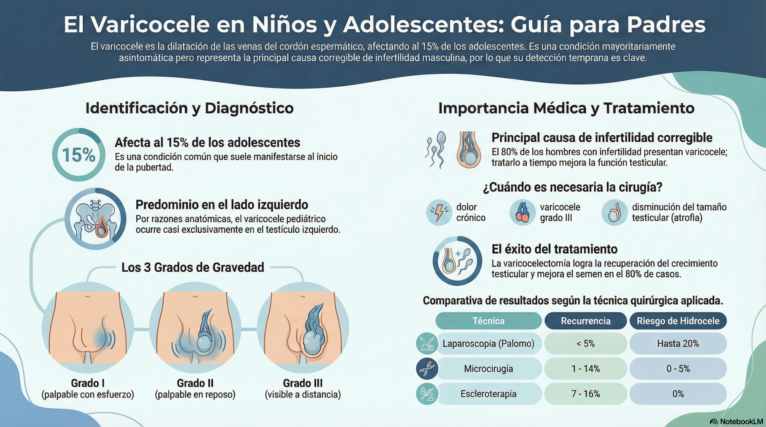 Importancia de la preservación: Actualmente, se priorizan las técnicas de preservación linfática para evitar el hidrocele y la preservación de la arteria espermática para asegurar una mejor calidad seminal a largo plazo.